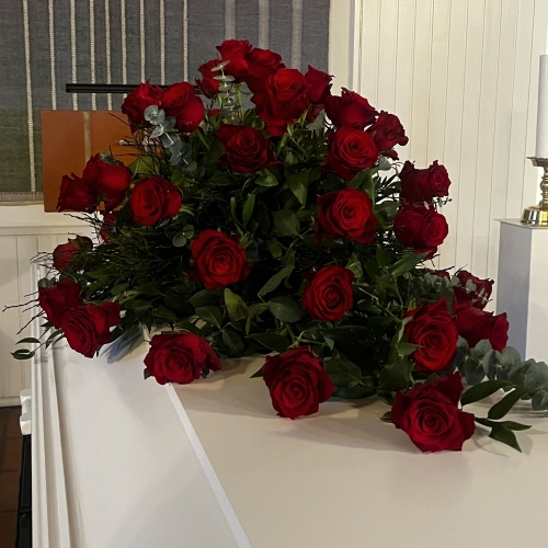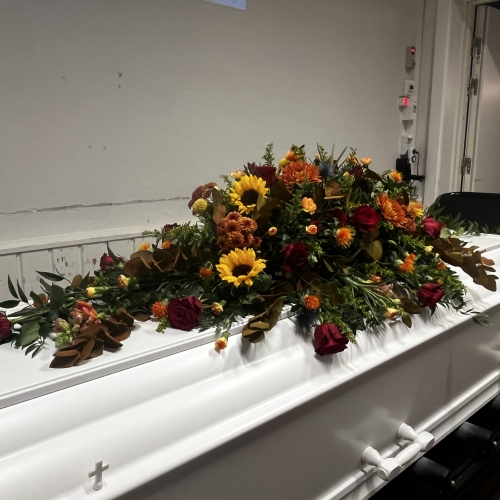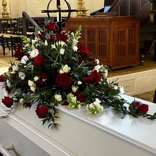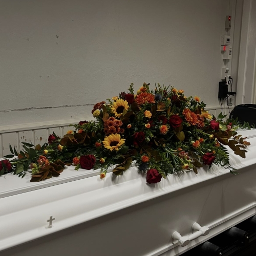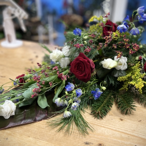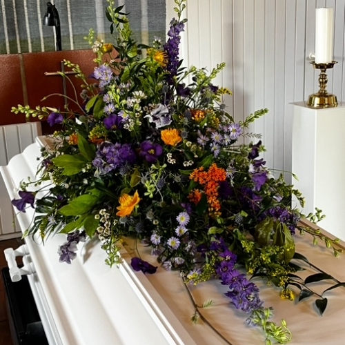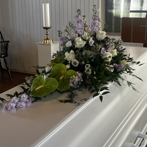 Vi tilbyder et bredt udvalg af begravelsesbinderi – fra kistepynt og kranse til bårebuketter og hjerteformede dekorationer. Hver opgave bliver løst med respekt, ro og forståelse for den svære stund.