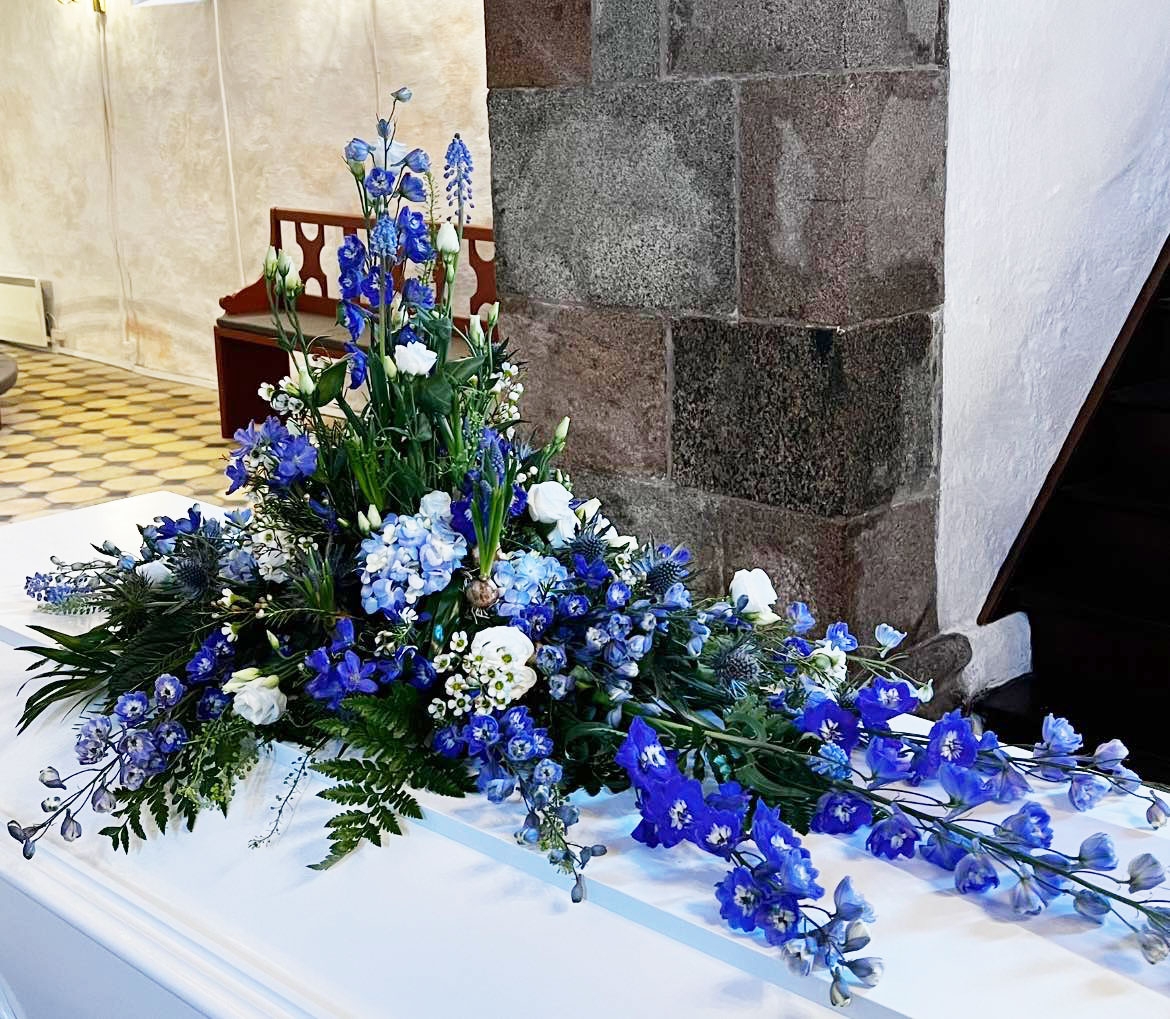 Personlig rådgivning – vi lytter til jeres ønsker. Mulighed for bånd med tekst og levering til kirke eller kapel. Vi står klar til at hjælpe jer med blomster, der udtrykker det, der ikke kan siges – og som skaber et smukt og værdigt farvel.